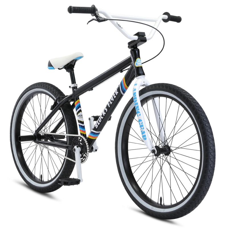 The SE Bikes Blocks Flyer 26 is a stylish and versatile big wheel BMX bike that is great for cruising around town or hitting the skate park. The 6061 aluminum frame with internal headset and mid bottom bracket provides a sturdy and responsive ride, while the full chromoly Landing Gear forks and SE Racing forged alloy cranks add strength and durability. The 26" x 2.4" Bozack tires offer great traction and a smooth ride, while the Promax V-brake and alloy brake lever provide reliable stopping power. The SE Flyer seat with custom SE bottle opener brace and SE Bikes Life grips with rubber end plugs add comfort and style to this impressive bike.