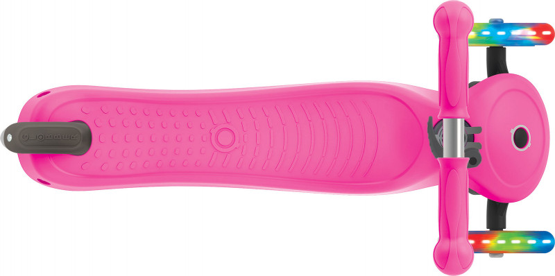 Once newbies are a pro at scooting, they can enjoy the glowtastic rides, as PRIMO PLUS LIGHTS is a kids scooter that comes with light-up scooter wheels, which flash in red, green and blue. Thanks to dynamo lighting integrated in the wheels' core, the scooter front wheels are battery-free and flash brighter the faster your kid scoots!