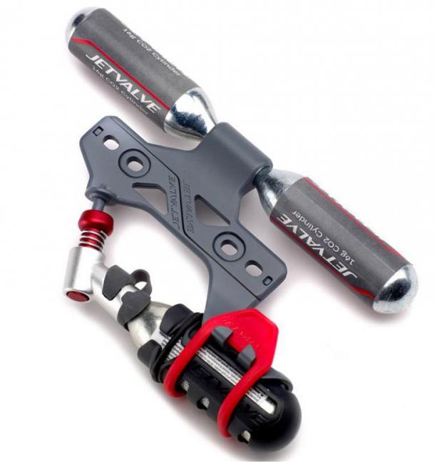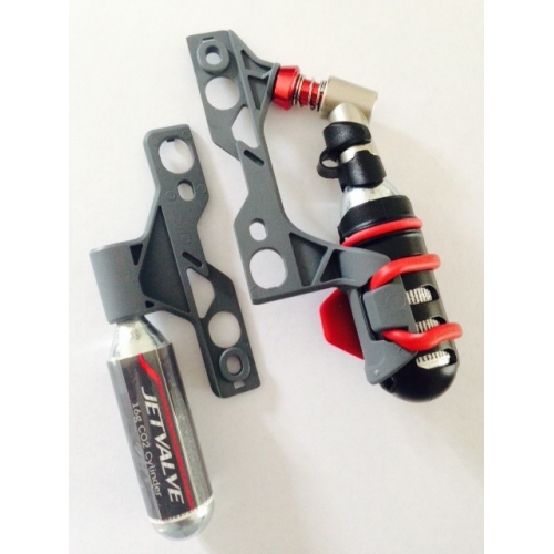 The new JetValve CO2 bottle cage mount system features an inflator for instant inflation of all bicycle valve types.Forget pumping away, this takes seconds!. Can be mounted jointly or separated and mounted to both bottle cage mounts.