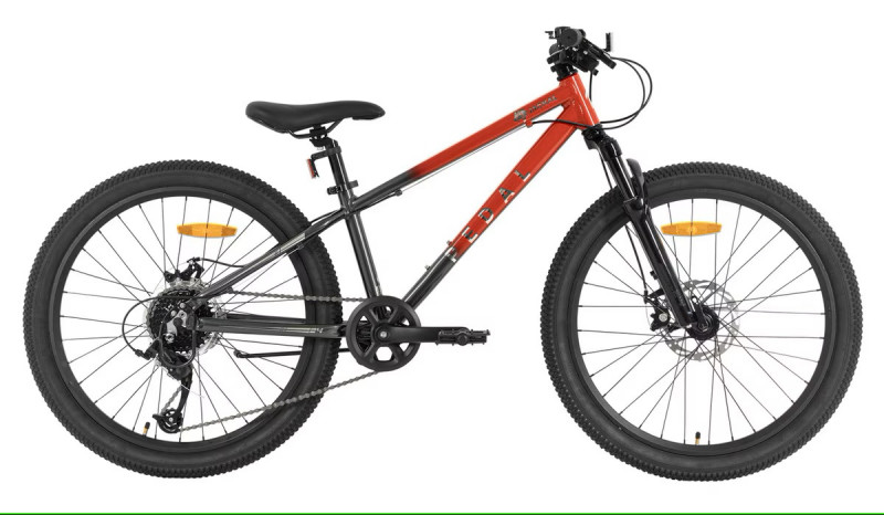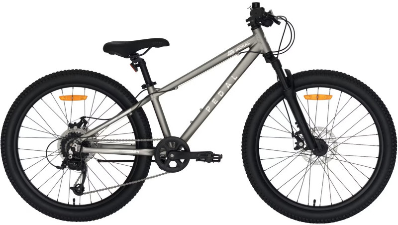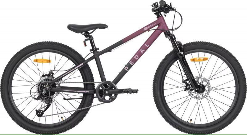 The Pedal Jackal 24 inch is a kid's mountain bike designed for young adventurers ready to explore beyond footpaths. It boasts a lightweight alloy frame and an 8-speed Microshift drivetrain for smooth thumb gear shifts and versatile riding. The mechanical disc brakes ensure reliable stopping power, and the alloy coil suspension fork absorbs shocks for a comfortable ride. Equipped with 24 inch all-terrain tires, this bike is perfect for handling various surfaces, making it ideal for kids who love exploring different terrains.